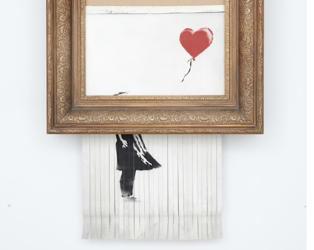 6 октября на аукционе «Сотбис» в Лондоне продавалась одна из самых знаменитых картин уличного художника Бэнкси «Девочка с воздушным шаром». Работа, помещенная в толстую позолоченную раму, была продана почти за миллион фунтов. Но как только аукционист объявил, что лот продан, рама зажужжала и картину начал разрезать спрятанный внутри механизм. Как предполагается, его привел в действие сам Бэнкси, тайно находящийся в зале.